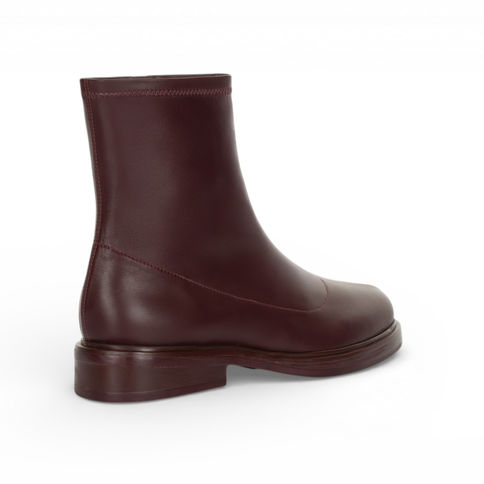 Bota de cano curto de pelica stretch na cor vinho, com confortável ajuste no tornozelo e visual minimalista.