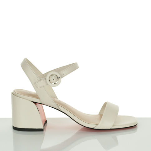 Claúdia, sandália de pelica off-white, salto bloco e sola coral.