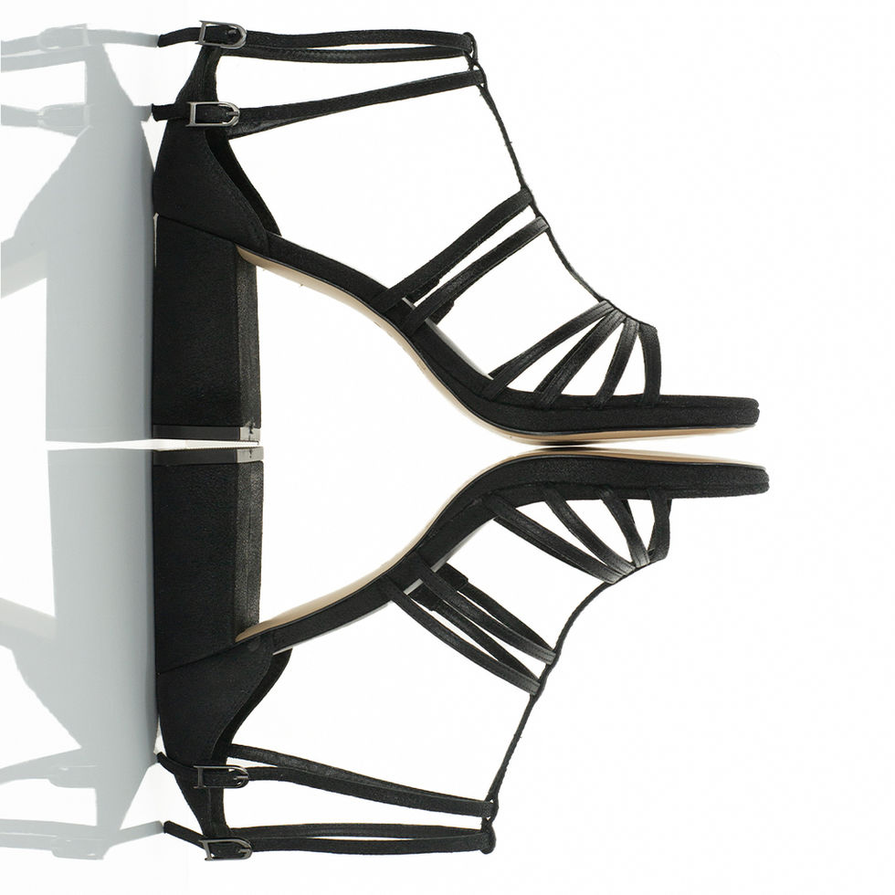 Sandália de couro camurça de pelica levemente metalizada preta.