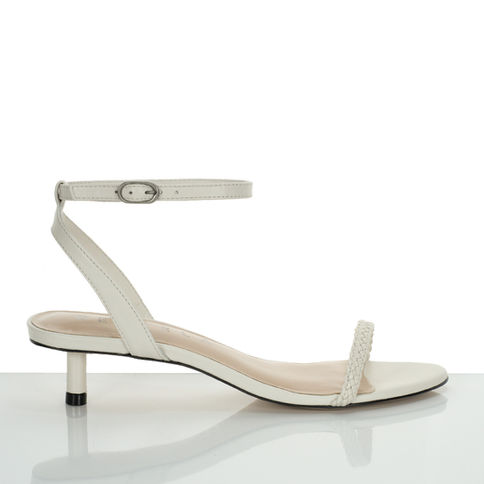 Marcela, sandália de pelica off-white com trança e salto de pino forrado.