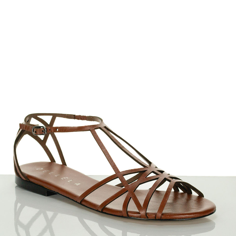 Essa rasteira em couro destaca-se pelo cabedal elaborado com recortes precisos feitos a laser, criando um efeito visual leve e sofisticado. A composição de tiras finas desenha os pés com elegância. Com fechamento de fivela no tornozelo. Sandália rasteira de couro pelica Tabaco.