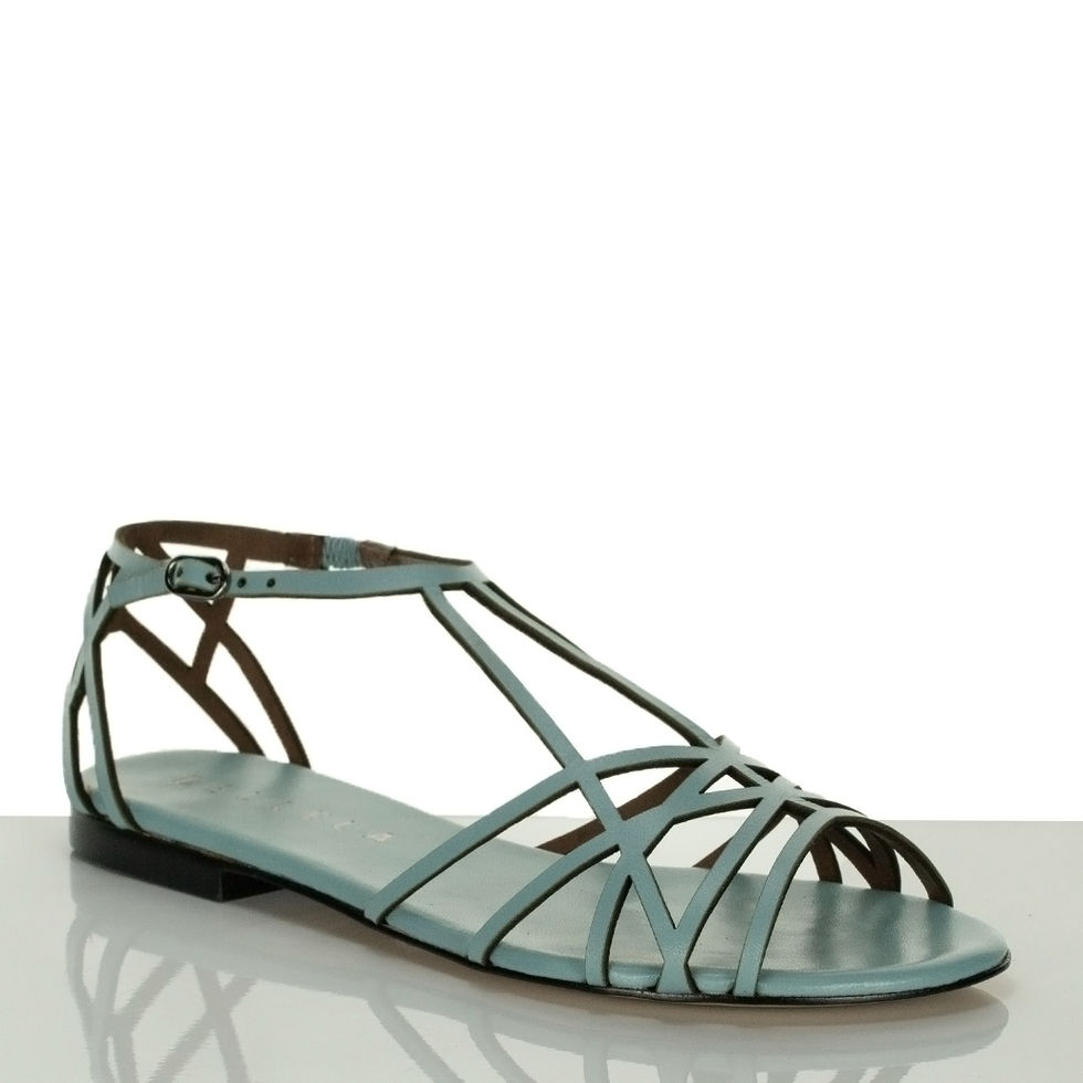Essa rasteira em couro destaca-se pelo cabedal elaborado com recortes precisos feitos a laser, criando um efeito visual leve e sofisticado. A composição de tiras finas desenha os pés com elegância. Com fechamento de fivela no tornozelo. Sandália rasteira de couro pelica azul maré.