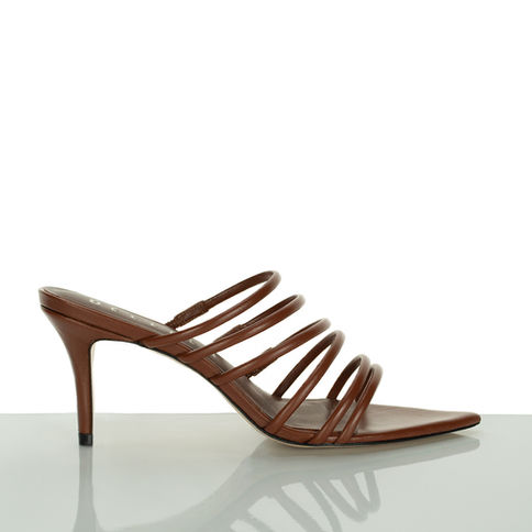 Teresa, mule com tiras de pelica tabaco, bico fino e salto alto.